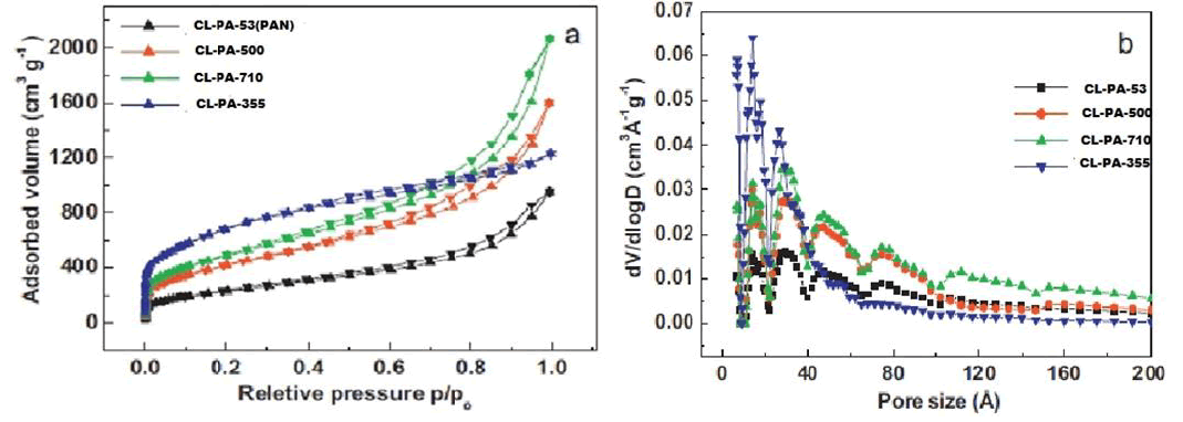Table 1 provides a summary of the properties of various activated carbons. Small volume (0.00148 m3/g) and low BET area (760.54 m2/g) belong to CL-PA-710. Treatment of CL-PA-355 with hot water resulted in an increase in BET surface area and pore volume. CL-PA-355 has a large pore volume and BET surface area. Most have mesopores (Figure 2 and Table 1). For CL-PA-355, the micropore surface area can reach 1060.57 m2/g, which is larger than the mesopore surface area of 1193 m2/g. Briefly, the BET area of the four materials increases in the following order: CL-PA-355, CL-PA-53, CL-PA-500, and CL-PA-710.