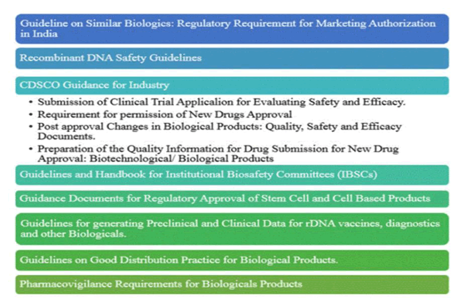 India and China are major contributors to the global biogeneric market. In 2012, India issued the Similar Biologics Guidelines through the Central Drugs Standard Control Organization (CDSCO) and the Department of Biotechnology. The guidelines are governed by the Drug and Cosmetics Act of 1945 and various rules pertaining to hazardous microorganisms/genetically engineered organisms or cells, established in 1989. These regulations oversee the manufacture, use, import, export, and storage of similar biologics (Figures 2 and 3) (Table 1).
