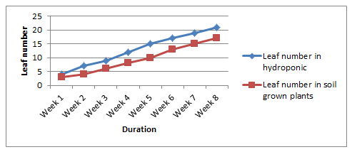 Leaf size and number: The leaf size of plants grown in the hydroponics system is very larger than the leaf size of plants from the soil. In the hydroponic system, the plants have more leaves than those plants grown in the soil it indicates the greater yielding in the hydroponics grown plants. The graphical comparison of both conditions in plants are given below (Imtiaz et al., 2015).