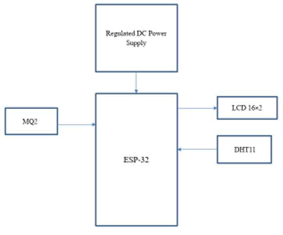 An IoT-based environmental pollution monitoring system utilizes interconnected components to gather and process data for real Power supply Figure 1. Block diagram. ESP-32: Esp-32 is known as system on chip microcontroller. It is a powerful and flexible microtroller which has gained more popularity recently in makers and IoT communities due to its feature and affordability. It features a dual core processor which allows it to handle tasks efficiently. It has built in Wi-Fi and bluetooth capabilities, making it easy to connect to the internet and communicate with the other devices wirelessly. It consists of 30 pins, which include GPIO pins, Power pins, analog pins, UART, SPI, I2C, PWM and control pins. Gas sensor: The gas sensor used is of variant MQ-2. It is sensitive to gases like carbon monoxide, methane, propane, sulphur dioxide and other combustible gases including smoke. It is a vital component in the field of environmental monitoring and safety applications. MQ-2 relies on a heated Metal Oxide Semiconductor (MOS) to measure changes in ISSN: 2315-5663 time pollution tracking. In this system, the ESP32 microcontroller serves as the central control unit. It interfaces with the MQ-2 gas sensor and the DHT11 temperature and humidity sensor. These components are represented as blocks in the block diagram. The ESP32 reads data from the MQ-2 sensor to detect various gases like carbon monoxide, methane, and smoke, while the DHT11 measures temperature and humidity levels. These readings are transmitted via the internet to a central server for data analysis and visualization. Arrows in the diagram show the flow of data from the sensors to the ESP32 and then to the server, depicting the functional relationships and information flow within the system (Figure 1).