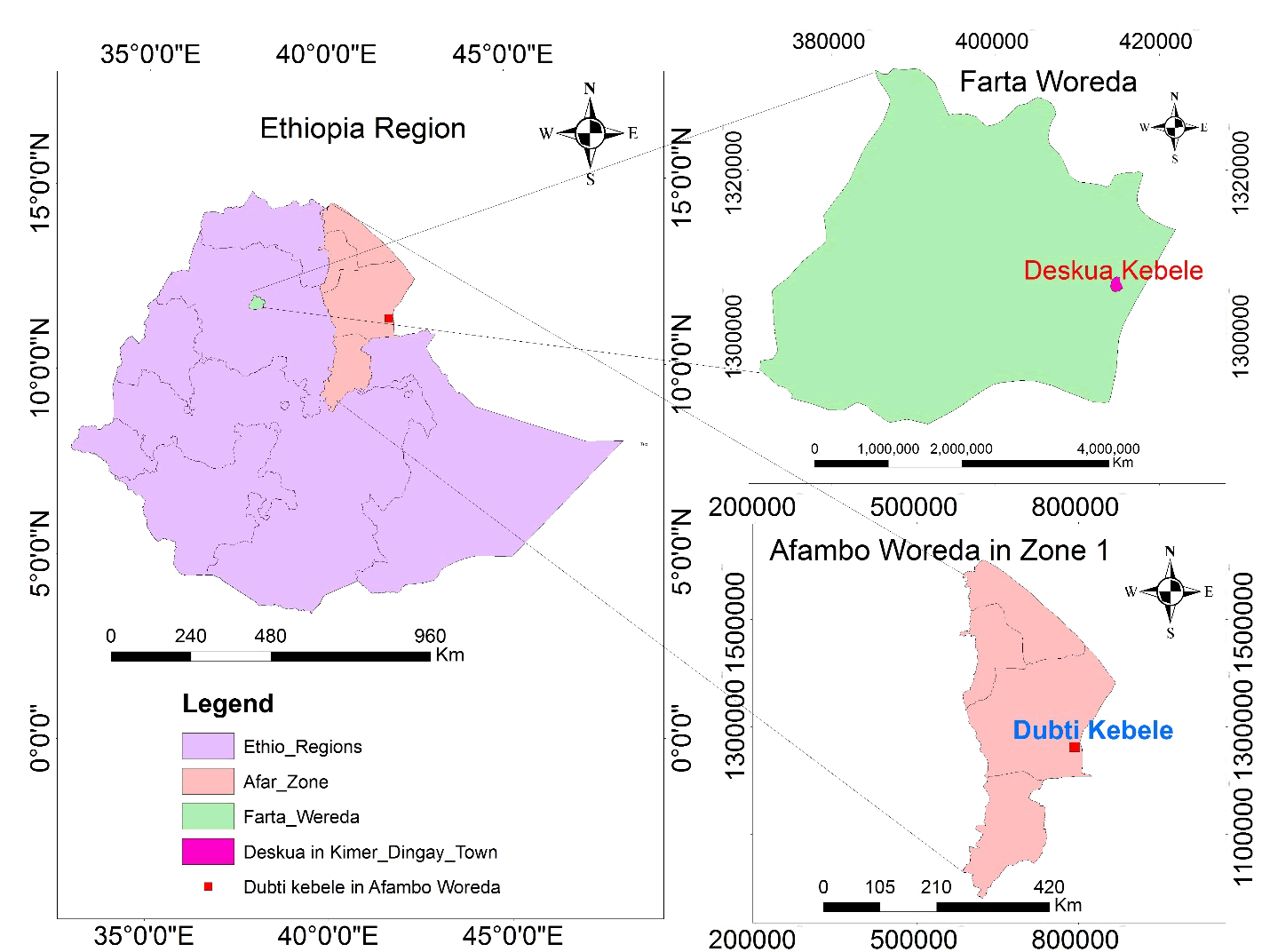Kimir-Dingay district is one of the study area included in this study. It is located in South Gondar Administrative Zone of the Amhara National Regional State, Ethiopia. It is at about 100 km north of the Regional Capital- Bahir Dar and 660 km north of the Addis Ababa. The total area of the Woreda is 109,925 hectares. According to CSA, Deskua kebeleis one of the kebele from this Woreda and located at Latitude: 12° 00' 0.00" N, Longitude: 38° 00' 0.00" E (Figure 1).