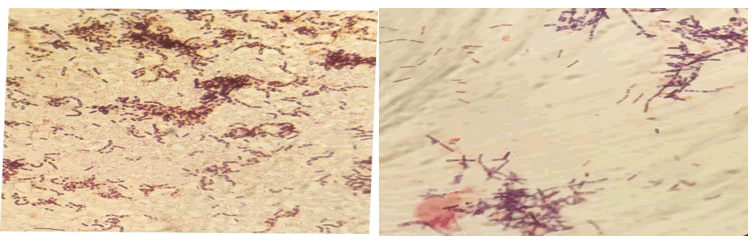 Gram staining characterization of bacterial isolates: As shown in figure 2 except DU1 and DU5 all isolates were Gram’s positive. The isolates were further characterized by a series of biochemical test as shown in Table 3.